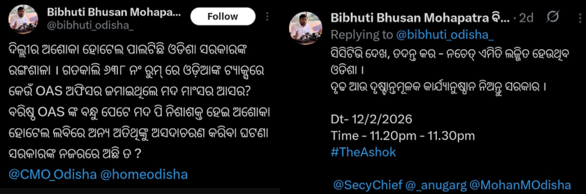 ସ୍ଥାନ ହେଉଛି ଦିଲ୍ଲୀର ଅଶୋକା ହୋଟଲ । ଫେବ୍ରୁଆରୀ ୧୨ ତାରିଖ ରାତିର ଘଟଣା । ଓଡ଼ିଶାର ଜଣେ ବାବୁଙ୍କ କାରନାମା ନେଇ ସୋସିଆଲ ମିଡ଼ିଆରେ ହଇଚଇ । ସୋସିଆଲ ମିଡ଼ିଆରେ ଚର୍ଚ୍ଚା ହେଉଥିବା ଖବର ଅନୁଯାୟୀ, ସରକାରୀ କାର୍ଯ୍ୟରେ ଦିଲ୍ଲୀ ଯାଇଥିବା ବାବୁ ଜଣକ ଅଶୋକା ହୋଟେଲର ୬୩୮ ନଂ ରୁମ୍ ରେ ଜଣେ ବନ୍ଧୁଙ୍କ ସହ କାଳେ ରହୁଛନ୍ତି। ଗତ ୧୨ ତାରିଖ ହଠାତ ହୋଟେଲ ଲବିରେ ଜୋର ପାଟିତୁଣ୍ଡ ଶୁଭିଲା। ଦେଖୁ ଦେଖୁ ଜଣା ପଡ଼ିଲା ଯେ, ଓଡ଼ିଶାର ଜଣେ ବାବୁଙ୍କ ରୁମ୍ କୁ ଆସିଥିବା ତାଙ୍କ ବନ୍ଧୁ ନିଶାଗ୍ରସ୍ତ ହୋଇ ହୋଟେଲ ଲବିରେ ବସିଥିବା ଅନ୍ୟ ମହିଳା ଅତିଥିମାନଙ୍କୁ ଅସଦାଚରଣ କରିବାର ଉଦ୍ୟମ କଲେ ଏହାକୁ ନେଇ ସେଠାରେ ସାଂଘାତିକ ପରିସ୍ଥିତି ସୃଷ୍ଟି ହୋଇଥିଲା । ବାବୁଙ୍କ ବନ୍ଧୁଙ୍କ ଦୌରାତ୍ମ୍ୟରେ ଭୟଭୀତ ହୋଇ କେତେକ ଭଦ୍ର ମହିଳା ହୋଟେଲ ଛାଡ଼ି ପଳାଇବାକୁ ବସିଲେ । ପରିସ୍ଥିତି ଅସମ୍ଭାଳ ହେବାରୁ ହୋଟେଲ କର୍ତ୍ତୃପକ୍ଷଙ୍କୁ ଶେଷରେ ହସ୍ତକ୍ଷେପ କରିବାକୁ ପଡ଼ିଥିଲା । ବୁଝୁ ବୁଝୁ ଜଣା ପଡ଼ିଲା ଯେ, ସରକାରୀ କାର୍ଯ୍ୟରେ ଯାଇ ହୋଟେଲରେ ରହୁଥିବା ଓଡ଼ିଶାର ବାବୁଙ୍କ ରୁମ୍ ରେ ବିଳମ୍ବିତ ରାତି ପର୍ଯ୍ୟନ୍ତ ଆସର ଚାଲିଥିଲା। ଯେଉଁଥିରେ ବାବୁ ଜଣକ ନିଜର ବନ୍ଧୁ ମାନଙ୍କୁ ଡାକି ଖୁବ୍ ଆପ୍ୟାୟିତ କରିଥିଲେ । ଦିଲ୍ଲୀର ଅଶୋକା ହୋଟେଲରେ ଘଟିଥିବା ଏହି ଘଟଣା ବାବଦରେ ଜଣେ ଛାତ୍ର କଂଗ୍ରେସ ନେତା ବିଭୂତି ଭୂଷଣ ମହାପାତ୍ର ତାଙ୍କ ‘ଏକ୍ସ’ ହାଣ୍ଡଲରେ ଏହି ଘଟଣା ବାବଦରେ ଉଲ୍ଲେଖ କରିବା ସହ ମୁଖ୍ୟମନ୍ତ୍ରୀ,ମୁଖ୍ୟମନ୍ତ୍ରୀଙ୍କ ଅଫିସ,ମୁଖ୍ୟ ଶାସନ ସଚିବ ଏବଂ ରାଜ୍ୟ ସରକାରଙ୍କ ଗୃହ ବିଭାଗକୁ ମଧ୍ୟ ଟ୍ୟାଗ୍ କରିଛନ୍ତି । ଆହୁରି ମଧ୍ୟ କଂଗ୍ରେସର ଏହି ଛାତ୍ର ନେତା ଲେଖିଛନ୍ତି ଯେ,ଦିଲ୍ଲୀର ଏହି ହୋଟେଲ ଏବେ ପାଲଟିଛି ଓଡ଼ିଶା ସରକାରଙ୍କ ରଙ୍ଗଶାଳା । ଏପରିକି ସରକାରଙ୍କ ଉଦ୍ଦେଶ୍ୟରେ ପ୍ରଶ୍ନ କରିଛନ୍ତି କେଉଁ ବାବୁ ଜଣକ ୬୩୮ ନଂ ରୁମ୍ ରେ ରହି ଓଡ଼ିଆଙ୍କ ଟିକସ ଅର୍ଥରେ ମଦ ମାଂସର ଆସର କରୁଥିଲେ ? ଖାଲି ସେତିକି ନୁହେଁ ସେହି ବାବୁ ଜଣକ ମଧ୍ୟ ନିଜର ବନ୍ଧୁ ମାନଙ୍କୁ ଡକାଇ ନିଶା ସେବନ କରାଇ ଅଶୋକା ହୋଟେଲ ଲବିରେ ଅନ୍ୟ ଅତିଥିଙ୍କୁ ଅସଦାଚରଣ କରିବା ଘଟଣା ଓଡ଼ିଶାର ସରକାରଙ୍କ ନଜରରେ ଅଛି ତ ବୋଲି ମଧ୍ୟ ପଚାରିବାକୁ ଭୁଲି ନାହାଁନ୍ତି । ସିସିଟିଭି ଦେଖି , ତଦନ୍ତ କରି ତୁରନ୍ତ ଏହି ବାବୁଙ୍କ ବିରୋଧରେ କାର୍ଯ୍ୟାନୁଷ୍ଠାନ ପାଇଁ ଦାବୀ କରିଛନ୍ତି ଏହି ଛାତ୍ର କଂଗ୍ରେସ ନେତା ।