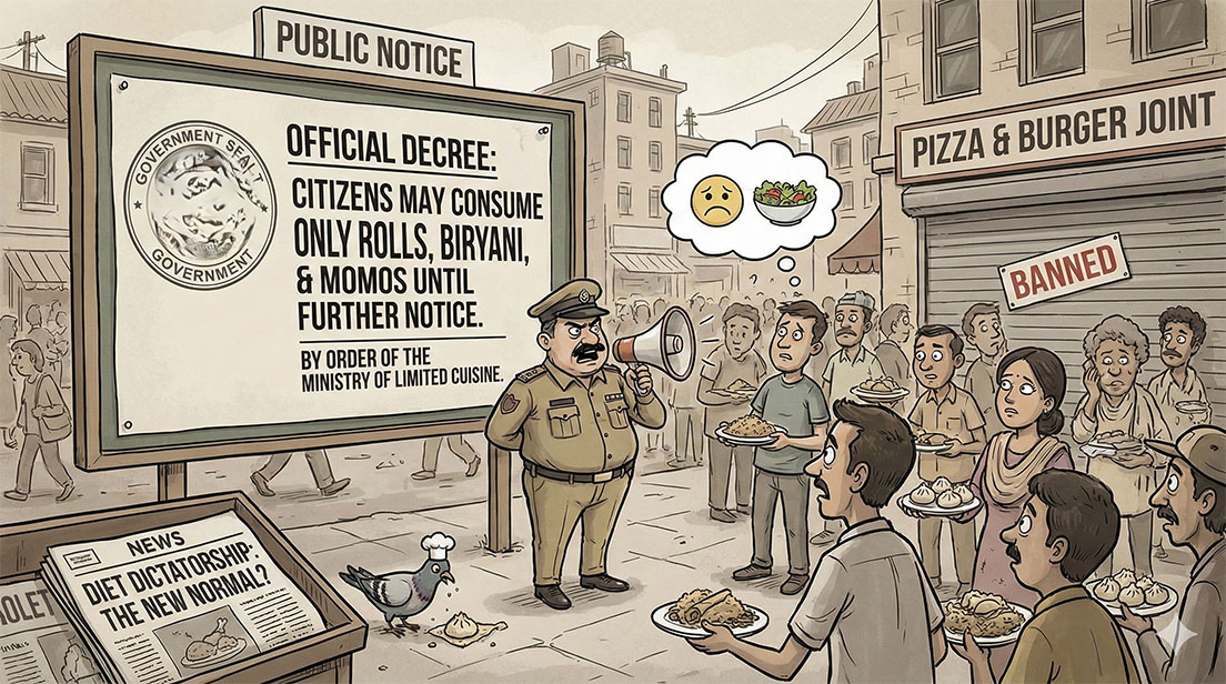 The Food Variety Board (fictional, but regrettably believable) reports 98% non-compliance with anything that doesn’t come wrapped in maida or swimming in biryani spice. Cafés offering “something different” have been gently escorted out of the market, often replaced overnight by another “Kolkata Roll Centre” or “Himalayan Momo Point,” both mysteriously serving the same neon-orange sauces.