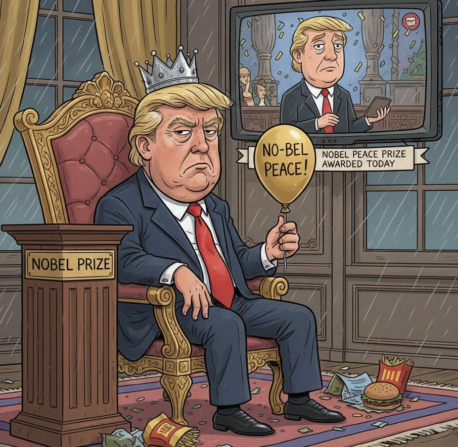 And so, the Nobel Peace Prize slipped from his grasp — not because he didn’t try, but because he tried too loudly. Still, somewhere in Mar-a-Lago, there’s probably a shelf marked “Reserved for Nobel.” And on that shelf sits a glimmering golf trophy that reads, perhaps a touch optimistically: “World’s Greatest Peacemaker.”