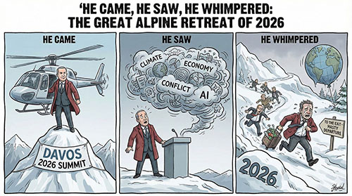 He came striding into Davos as if history itself were waiting for his autograph. Cameras flashed. Journalists held their breath. For about eleven minutes, hope lived. But then came the great realization: the applause was for the snowfall, not the statesmanship.