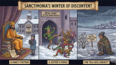 While the rest of the world’s elite have flocked to the snowy peaks of Davos to discuss the global economy over hot cocoa and high-stakes deals, our King remains grounded in the foggy flats of Sanctimonia. He is, to put it mildly, sulking.